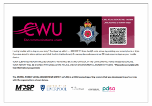You can download the MOU by clicking on the following link Postal Workers MOU Lancs 2025 If you are having a problem or have concerns about a dog while at work, you can use the union’s ATLAS system to submit a report. It will take less than 5 minutes to complete. This will be urgently reviewed by a CWU officer if the concern you have raised is serious. Your report will be shared with Lancashire police and/or environmental health officers. Please see the poster below, which will be displayed in every Royal Mail Delivery office in Lancashire.